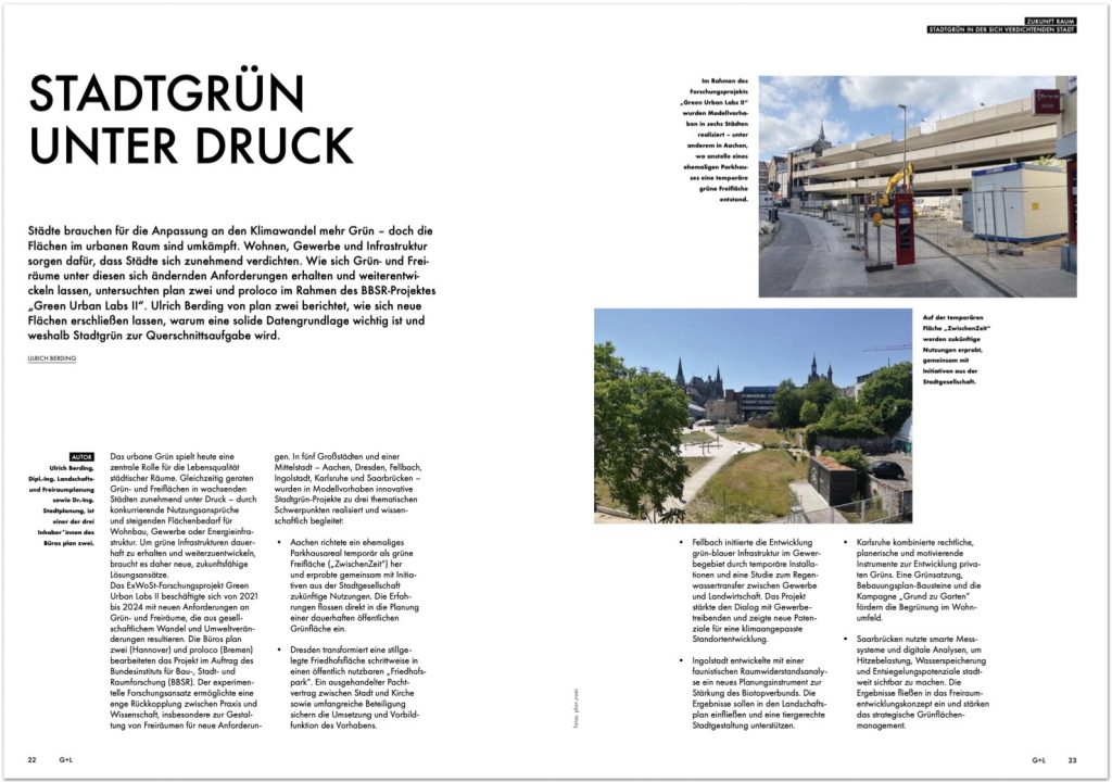 Im ExWoSt-Forschungsprojekt „Green Urban Labs II“ begleiteten wir gemeinsam mit proloco (Bremen) die sechs Modellvorhaben Aachen, Dresden, Fellbach, Ingolstadt, Karlsruhe und Saarbrücken bei der Untersuchung der Frage, wie Grün in sich verdichtenden Städten gesichert, entwickelt und besser vernetzt werden kann. In der aktuellen Ausgabe der Garten+Landschaft berichtet Ulrich Berding über Eckpunkte und Ergebnisse des Projektes.