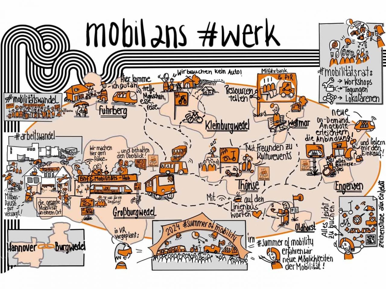 Raum: Suburbaner und ländlicher Raum, Stadt Burgwedel Zeitraum: 03/2023–12/2024 Auftraggeberin: Stadt Burgwedel Leistung: Erarbeitung von Workshops mit den Unternehmen und übergeordneten Akteuren, Gründung eines Mobilitätsforums sowie Beteiligung der Einwohner*innen zur Entwicklung von Mobilitätsstationen Webseite: www.mobil-ans-werk.de (externer Link)