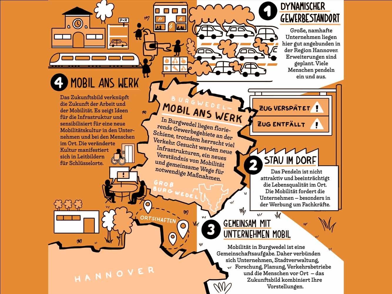 Burgwedel ist eine prosperierende Kommune im suburbanen Raum mit stark frequentierten Gewerbegebieten. Die Stadt steht vor der Aufgabe, ihre Unternehmen als attraktive Arbeitswelt für das digitale Zeitalter neu zu erfinden. Zurzeit verändern sich dabei gleichzeitig individuelle Mobilitätsmuster und die Ansprüche an die Wege von und zur Arbeitsstelle. Aus der Balance der Veränderung der Arbeitswelten und Veränderung der Mobilitätsmuster entsteht ein erhebliches Potenzial für ein nachhaltiges Mobilitätssystem. Dabei geht es nicht nur um Pendelströme und betriebsinterne Mobilitätskonzepte, sondern weit darüber hinaus. Die Zukunft der Mobilität muss eng mit den Vorstellungen künftiger Arbeit entwickelt und räumlich neu definiert werden. Für diese Aufgabe müssen viele Akteur*innen ihre Arbeit koordinieren: Unternehmen, Kommune, Politik, Verkehrsbetriebe, Wissenschaft und Praxis.