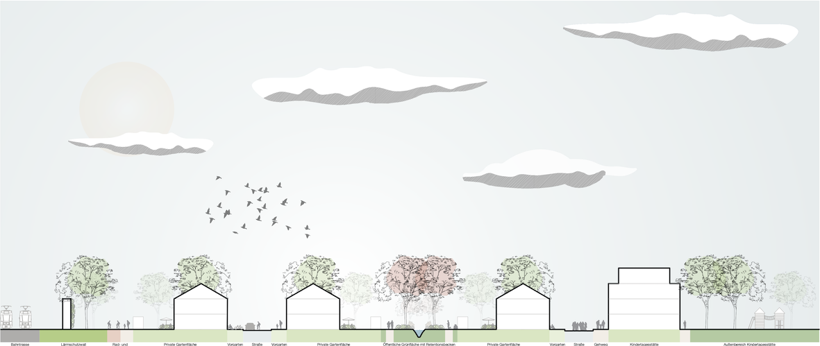 Vor diesem Hintergrund hat plan zwei verschiedene Entwicklungsperspektiven für das Gelände entworfen. Der ausgewählte Entwurf „Grünachse“ setzt sich aus verschiedenen Nachbarschaftsclustern zusammen. Als Grundform dominiert das Reihenhaus in zwei unterschiedlichen Größen. Ergänzend dazu sind Mehrfamilienhäuser und eine Kita geplant. Die Qualität des Wohnstandorts ist maßgeblich von drei Rahmenbedingungen beeinflusst: In erster Linie der direkten Anbindung des neuen Wohnstandorts an die S-Bahn, zweitens der Verbindung der Wohnlage mit den qualitätvollen umgebenden Landschaftsräumen und drittens der räumlichen und sozialen Integration des Wohngebiets in den Siedlungsbestand.