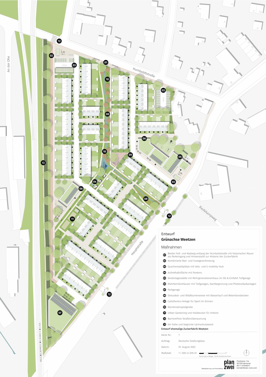 Raum: Gelände der ehemaligen Zuckerfabrik in Weetzen Zeitraum: 02/2022–07/2022 Auftraggeberin: Deutsche Siedlungsbau im Auftrag der Wohnpark Weetzen GmbH Leistung: Erarbeitung von Entwicklungsperspektiven für das Gelände der ehemaligen Zuckerfabrik