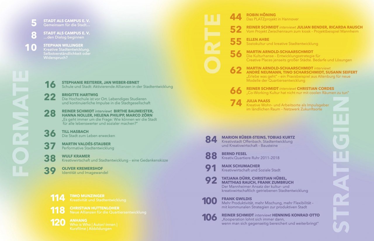Das Magazin „Kreative Stadtentwicklung – Orte, Formate, Strategien“ basiert auf Ergebnissen, Diskursen und Beobachtungen einer von Stadt als Campus e. V. durchgeführten explorativen Studie „Kreativwirtschaft und Stadtentwicklung“, gefördert vom Bundesinstitut für Bau-, Stadt- und Raumforschung (BBSR). Die Studie hat Schüler*innen, Studierende, Kultur- und Kreativschaffende, kulturelle und soziokulturelle Einrichtungen mit Vertreter*innen von Gebietskörperschaften ins Gespräch gebracht. Gemeinsam wurden Handlungsansätze für eine aktivierende, kooperative, mithin „kreative“ Stadtentwicklung identifiziert, herausgearbeitet und erprobt. Die hier versammelten Beispiele sind Zwischenergebnisse kreativer Prozesse vor Ort, bauen auf Eigendynamik, sind anschlussfähig und warten auf Weiterentwicklung. Nahezu täglich kommen neue Beispiele hinzu. Das Redaktionsteam und das BBSR, Partner und Förderer dieses Magazins, freuen sich mit den Autor*innen und Gesprächspartner*innen darauf, hiermit den Dialog zu beginnen, fortzusetzen und auszuweiten, um kooperative Formate, Orte und Strategien auf den Weg zu bringen.