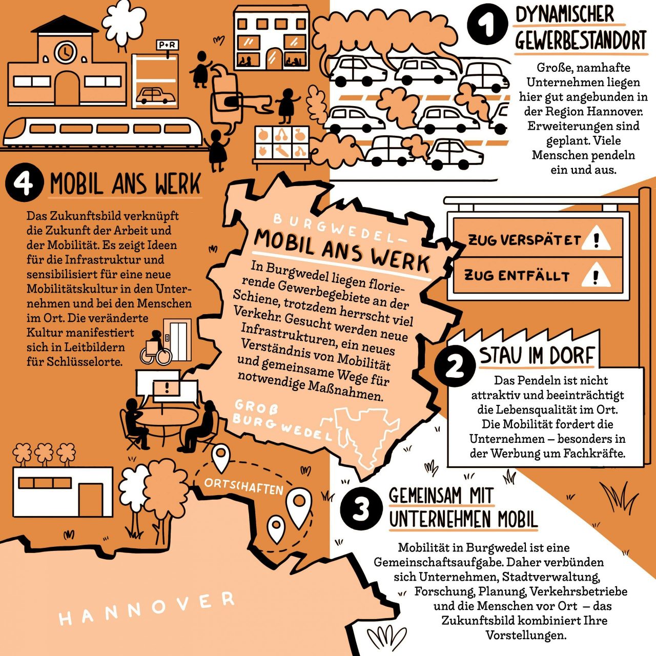 Mit Unternehmen aus der prosperierenden Kommune Burgwedel in der Region Hannover, der kommunalen Wirtschaftsförderung und der Region Hannover konnten wichtige Partner für das Projekt gewonnen werden. Die Aufgabe ist, gemeinsam mit den örtlichen Unternehmen eine attraktive Arbeitswelt für das digitale Zeitalter neu zu erfinden. Gleichzeitig verändern sich individuelle Mobilitätsmuster und die Ansprüche an die Wege von und zur Arbeitsstelle. Diese Veränderungen bilden ein Potenzial für ein nachhaltiges Mobilitätssystem. Im Rahmen des Wettbewerbs werden die zahlreichen individuellen Anforderungen an Mobilität aufgedeckt und kooperativ im Rahmen verschiedener Beteiligungsformate zu einem gemeinsamen Zukunftsbild verknüpft.