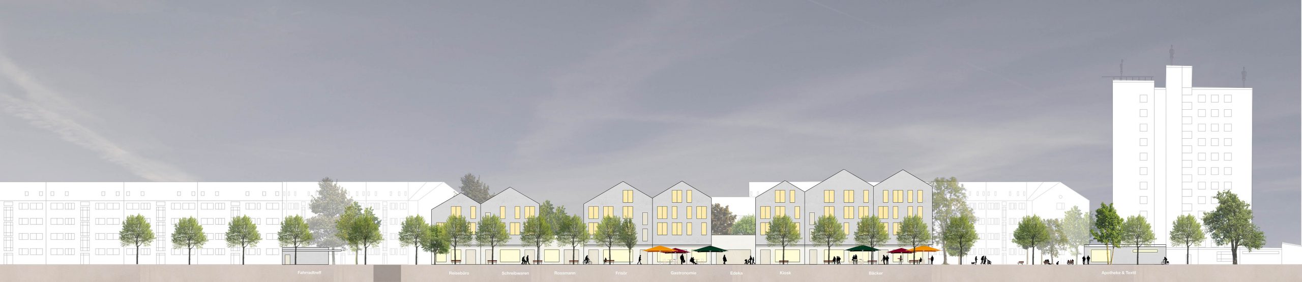 Das Stadtteilzentrum der Siedlung Drispenstedt ist eine raumgewordene Utopie der 1950er Jahre. Inzwischen entsprechen Gestaltung und Raumangebot nicht mehr den aktuellen Ansprüchen. In einem Gutachterverfahren des örtlichen Wohnungsunternehmens präsentierte plan zwei einen Vorentwurf zur Integration neuer Bedarfe des Einzelhandels an zentraler Stelle. Aufbauend auf der langjährigen Begleitung der Siedlung im Rahmen der sozialen Stadterneuerung kennzeichnet den Vorentwurf die städtebauliche Rahmenbedingung der umgebenden Zeilenbebauung. In der kompakten Neuinterpretation werden Entwurfselemente der Ideenwelt des Siedlungsbaus mit den Maßgaben eines zentralen Raums im 21. Jahrhundert gebündelt. Es entstehen Räume der Begegnung, ergänzende Wohnraumangebote und eine gestalterische Integration der neuen Freiräume mit den Zeilenzwischenräumen. Zentrale Fragen der verkehrlichen Erschließung und Fragen zum angestrebten Raumprogramm können anhand des Vorentwurfs diskutiert werden.